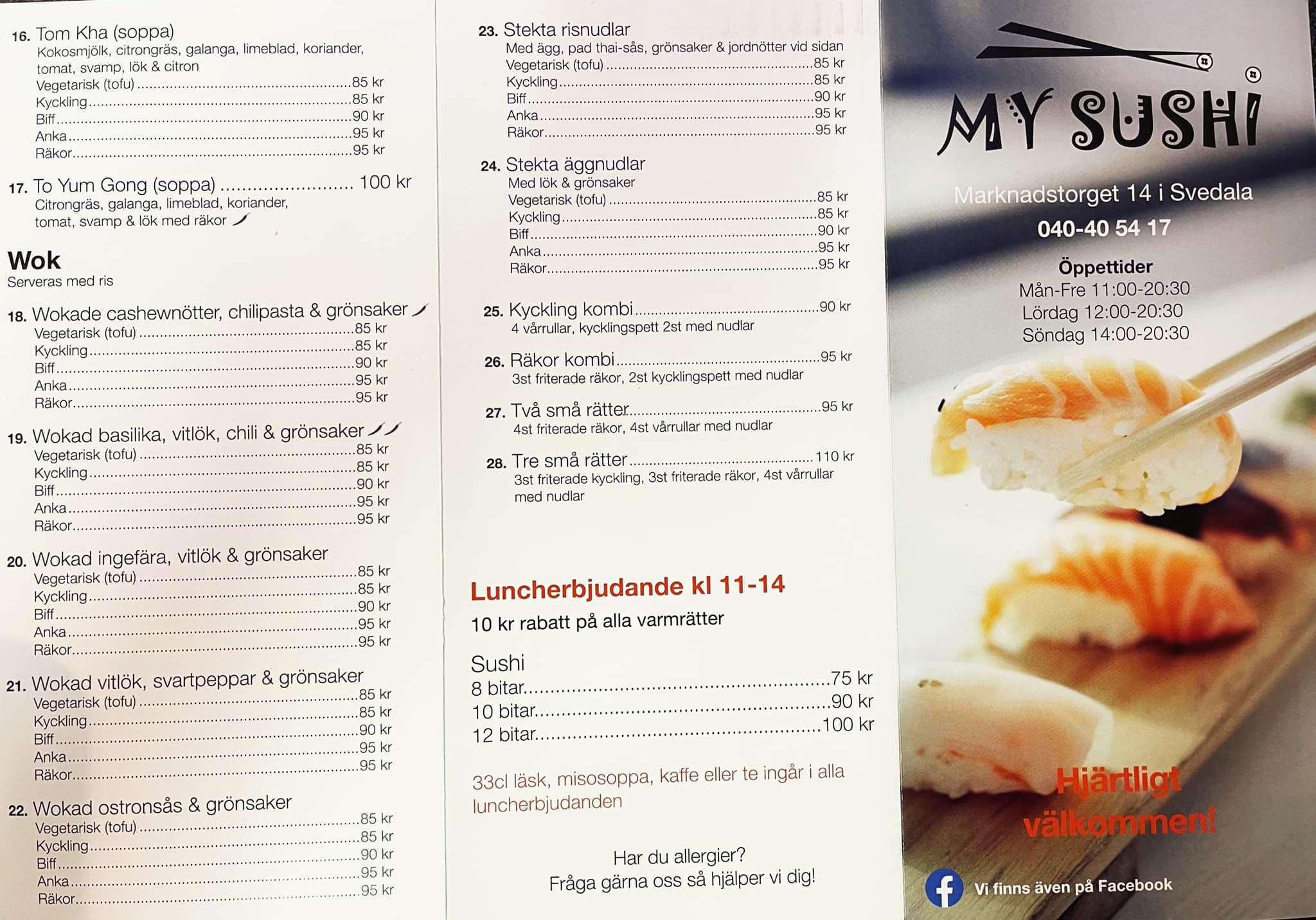 My Sushi befinner sig i Svedala och har fått 4,5 av 5 stjärnor på sociala medier, ett enormt bra betyg! Besökare anger t.ex. följande: “Bästa sushi stället i Sverige enligt mig stora bitar så man blir mätt och bra kvalite. Vi kommer gärna tillbaka. Prova denna pärla!!!”