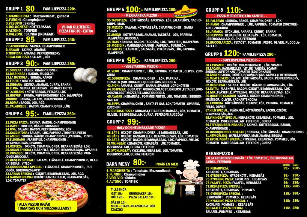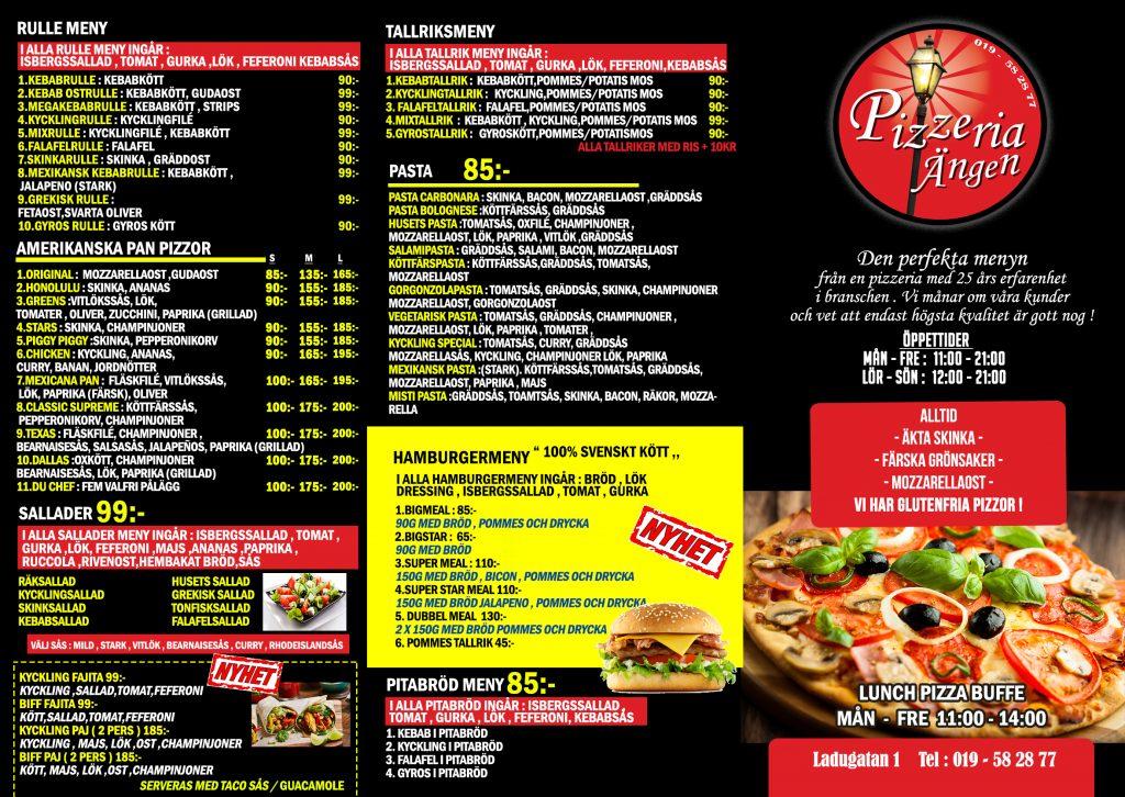 Pizzeria Ängen Örebro befinner sig i Örebro. Besökare anger följande: “Beställde mixpizza för 100kr. Väldigt gott och fresh pizza. 2 stjärnor. Nummer 65 på menylista! Värd o prova! Minuspoäng är att dem inte har sallad + att det inte finns toalett.”