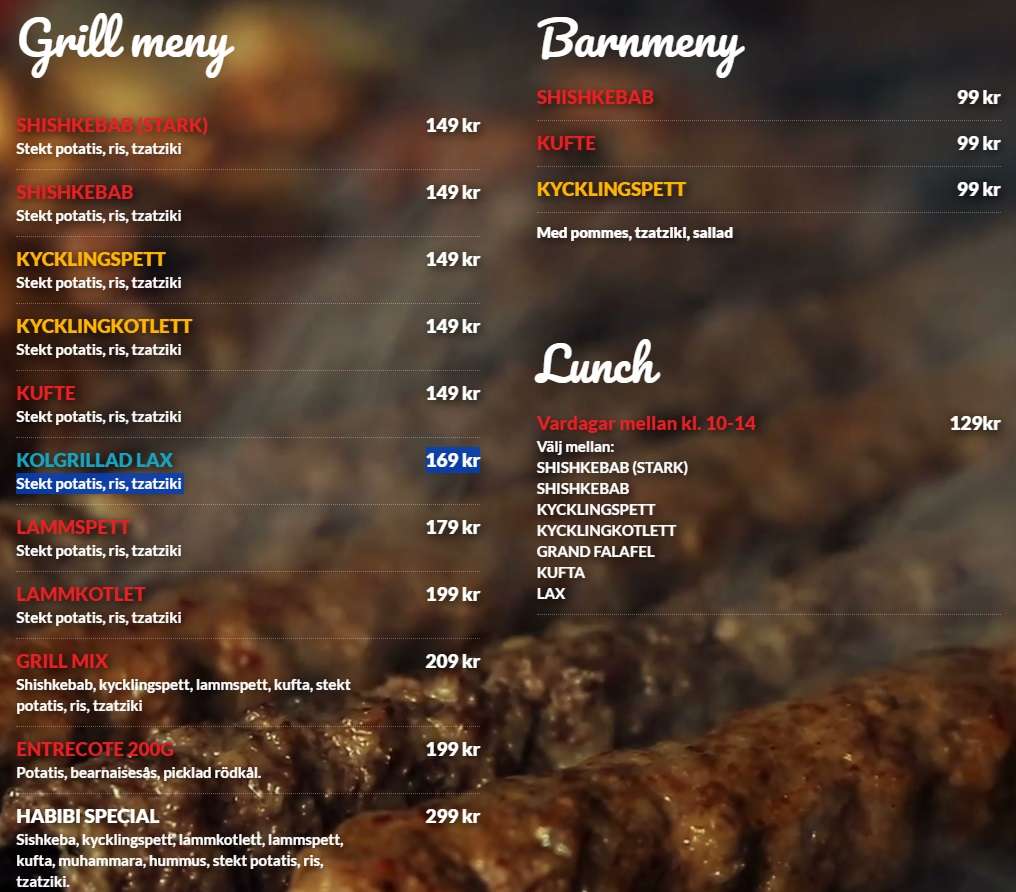På Yalla Habibi Kungälv äter du libanesisk, medelhavs, prisklass per person är normalt: SEK 97 – SEK 240, även om det kan finnas avvikelser. Om det låter bra rekommenderar vi att du ringer restaurangen för att – vid behov – boka ett bord eller för att beställa mat om restaurangen erbjuder hemleverans.